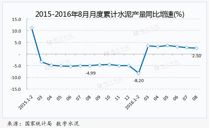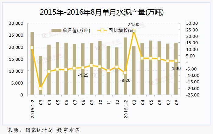 2016年1-8月份,全國規模以上水泥產量15.4億噸,同比增長2.5%,增速較1-7月下降0.3個百分點。8月份全國單月水泥產量2.2億噸,同比增長1%,與上月基本持平,略有增長。