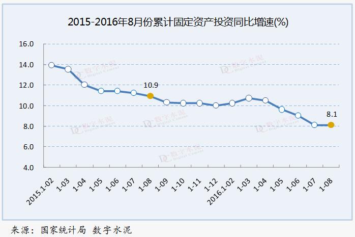 2016年1-8月份,全國固定資產投資(不含農戶)36.63萬億元,同比名義增長8.1%,增速與1-7月份持平,低于去年同期2.8個百分點。從環比速度看,8月份固定資產投資(不含農戶)增長0.58%。